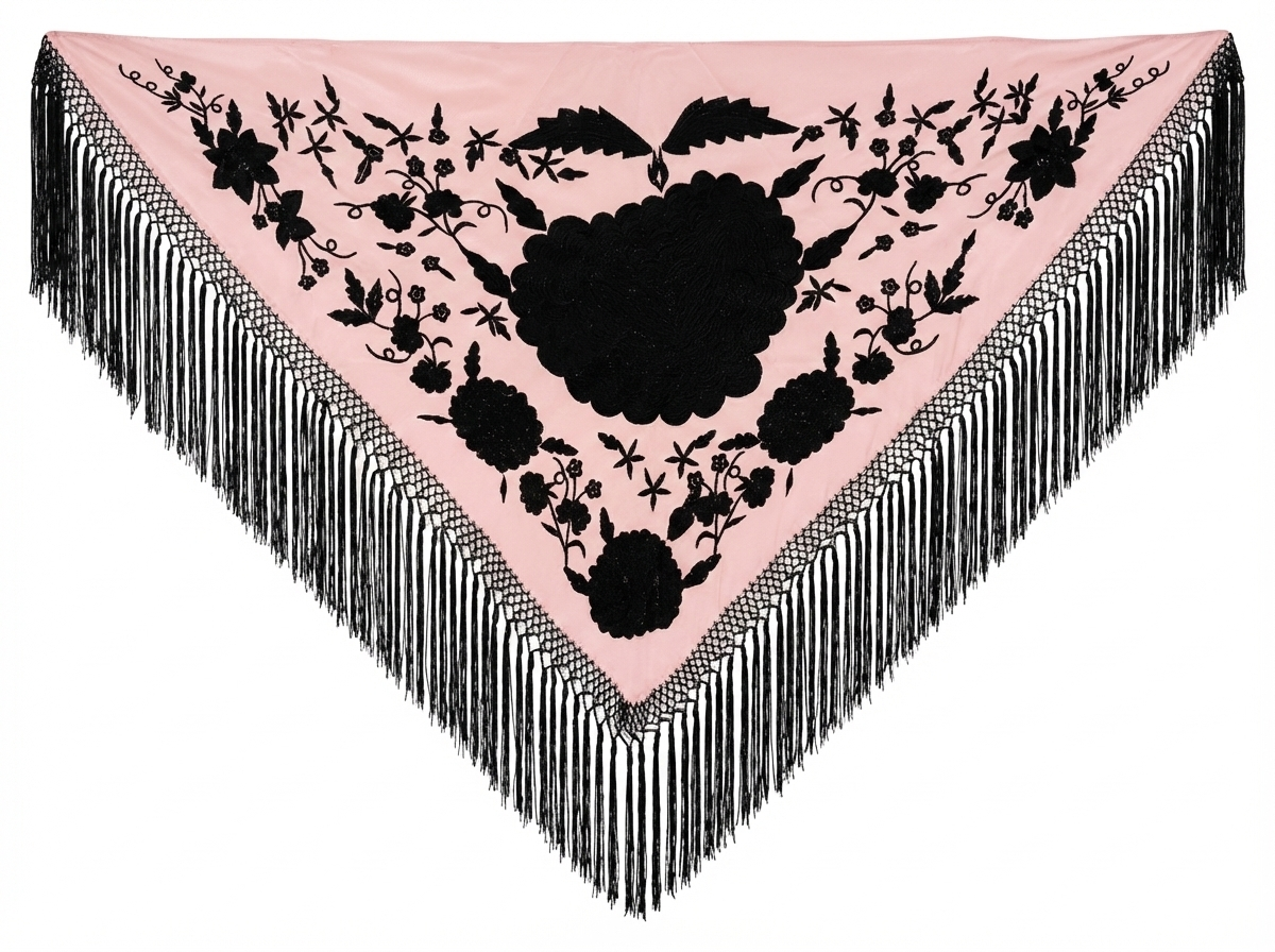 Elegante mantoncillo triangular en un suave tono rosa palo, que cobra vida gracias a su intenso y tupido bordado floral en color negro azabache. Destaca por su espectacular enrejado y sus larguísimos flecos de seda extra finos, que aportan un movimiento inigualable. El complemento perfecto para elevar tanto un traje de flamenca como un look de invitada.