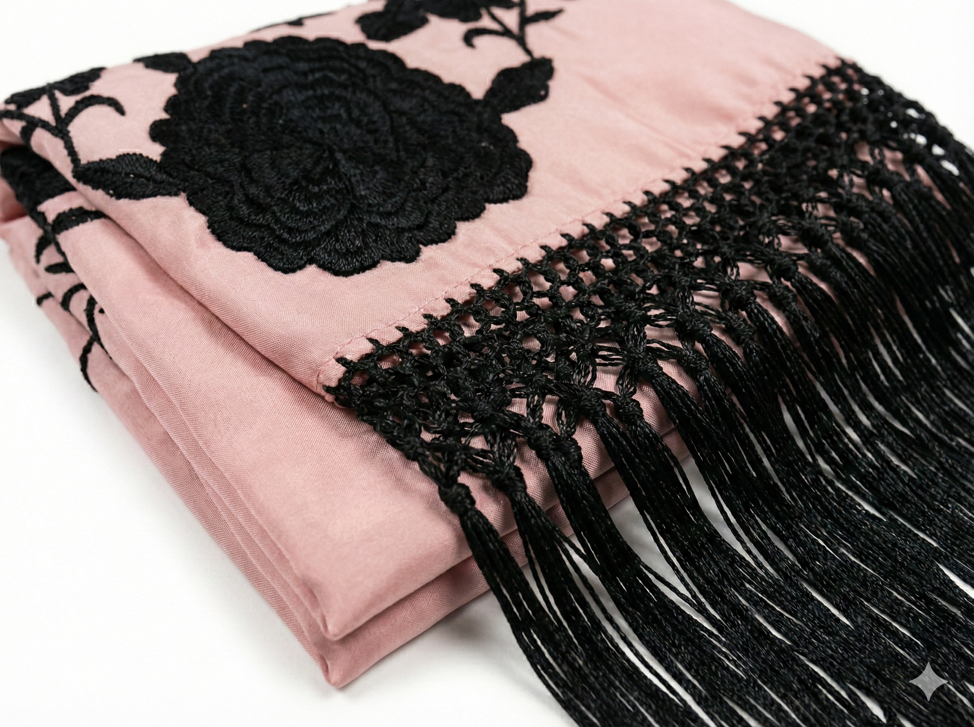 Imagínalo: la base es un tejido de tacto seda en un color rosa palo, casi nude, que aporta la luminosidad y la delicadeza. Sobre este lienzo romántico, hemos volcado la pasión del sur con un bordado en hilo negro intenso. El motivo central es un gran medallón floral, rodeado de ramilletes que parecen trepar por la tela, creando un contraste visual hipnótico que recuerda a los encajes antiguos y a la tradición más pura.