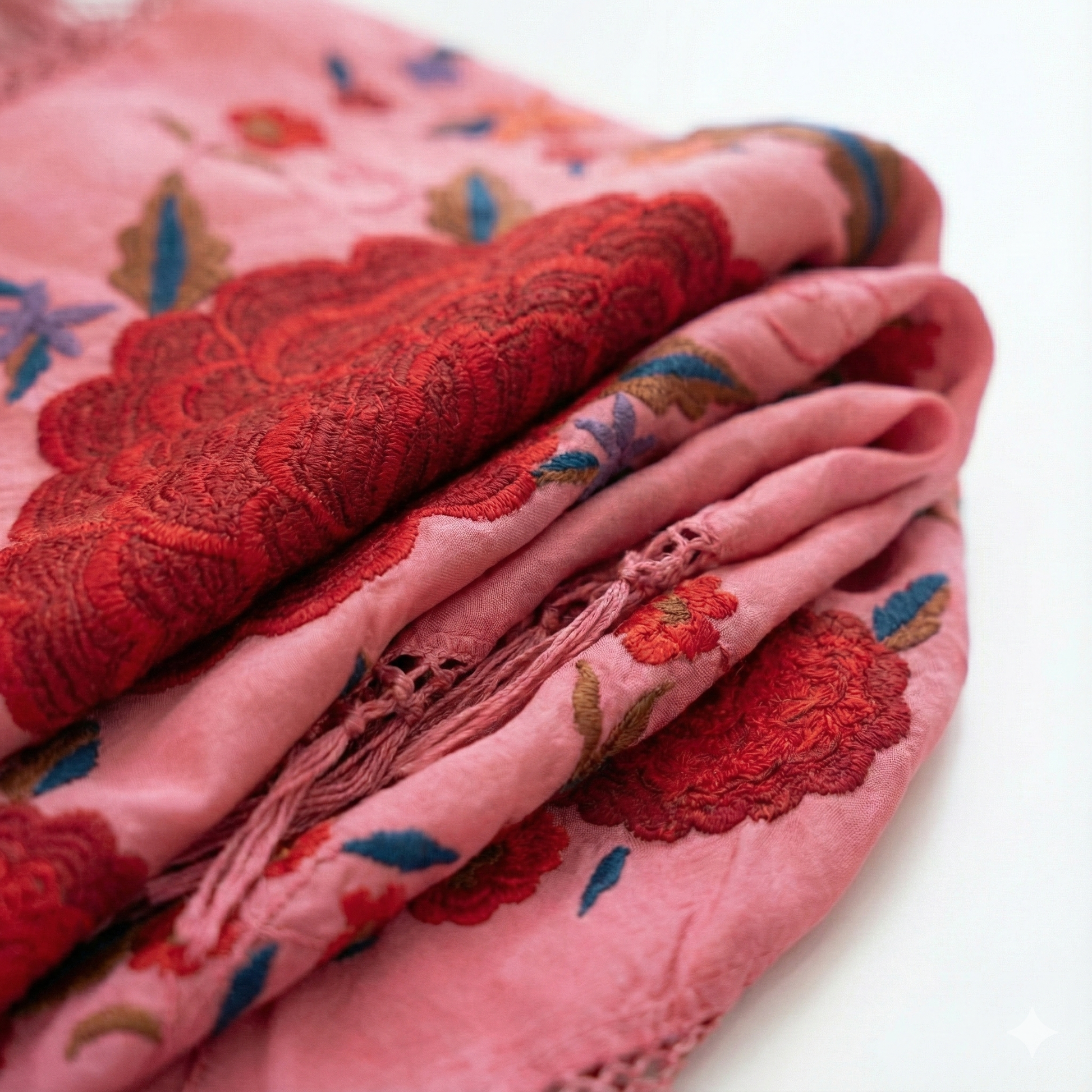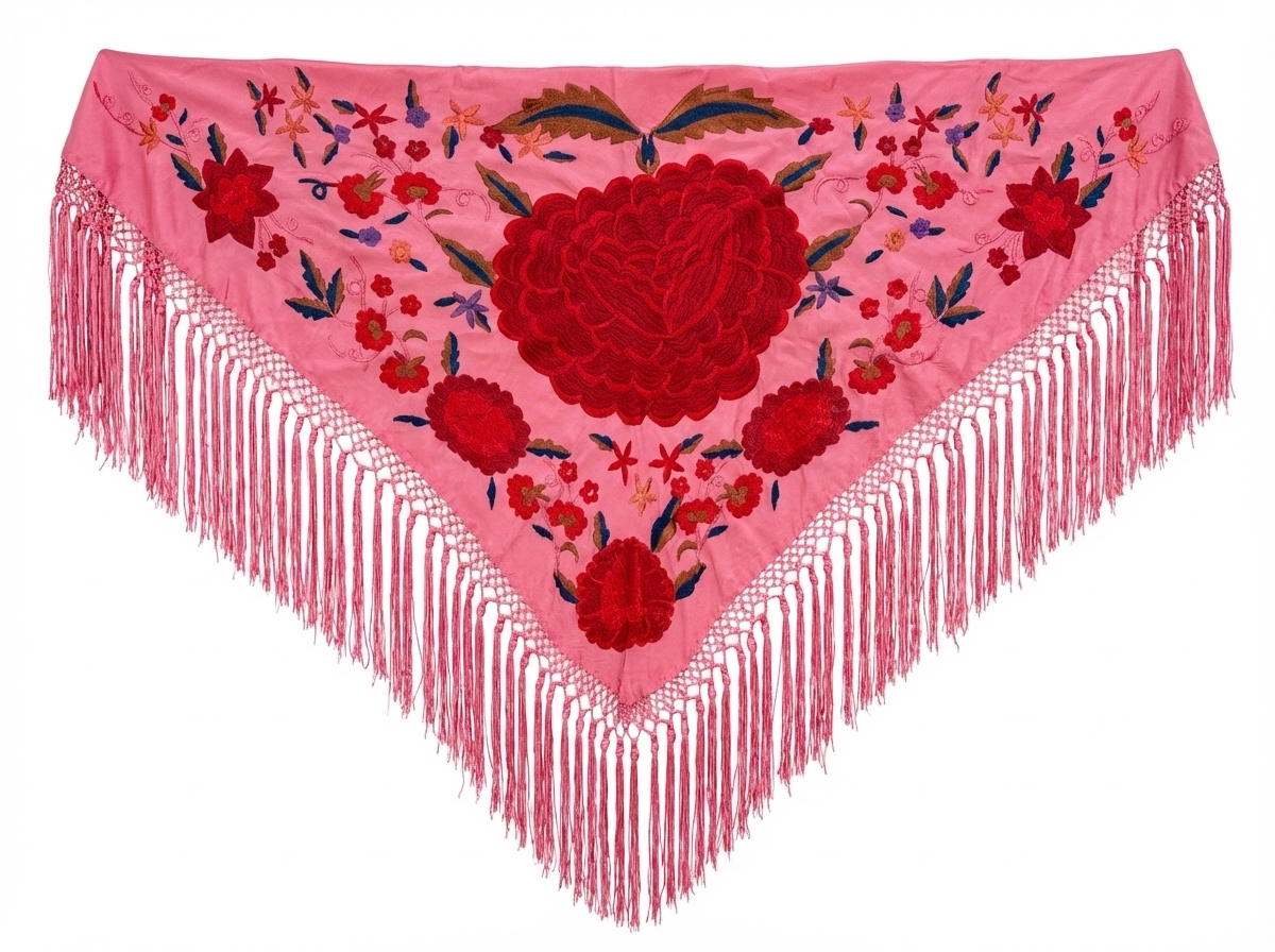 Un estallido de color y tradición. Este mantoncillo triangular en vibrante seda rosa destaca por su espectacular bordado central: una gran rosa roja en relieve rodeada de claveles y motivos florales en tonos azules, verdes y tierra. Rematado con un largo y sedoso fleco rosa a tono. El complemento definitivo para elevar tu traje de flamenca o aportar un toque de distinción y duende a tu look de invitada.