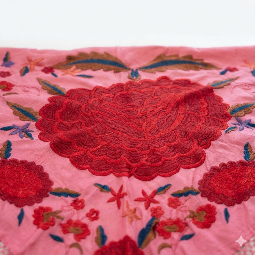 Imagínatelo: una base de seda en un rosa intenso y alegre, un color que da luz a la cara y alegría al cuerpo. Pero la verdadera magia ocurre en el centro. Como si hubiese brotado de la misma tela, una majestuosa rosa roja, bordada con tal densidad y relieve que casi puedes sentir la textura de sus pétalos al pasar la mano. A su alrededor, un cortejo de claveles más pequeños, hojas y ramitas en tonos azul añil, verde oliva y marrones, crean un contraste cromático que es puro arte andaluz.