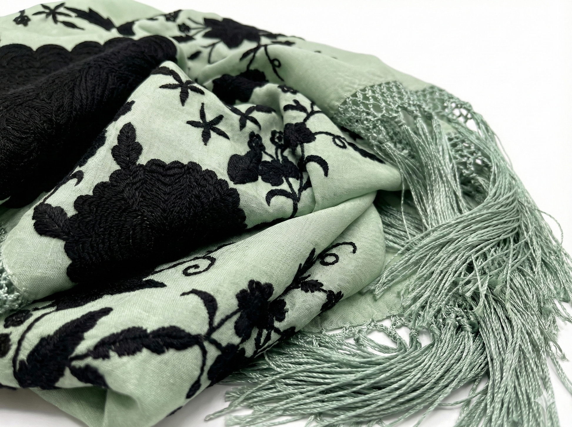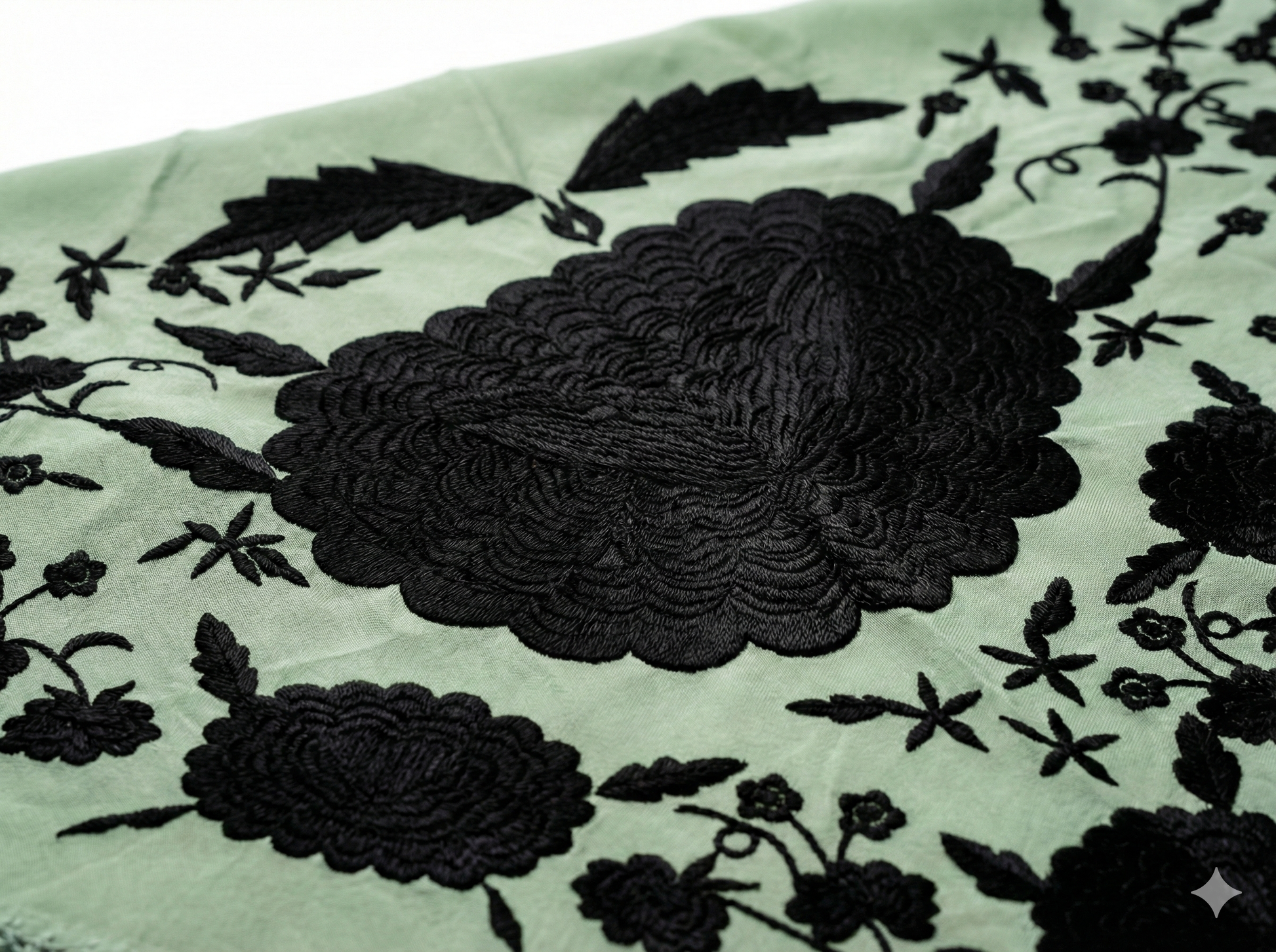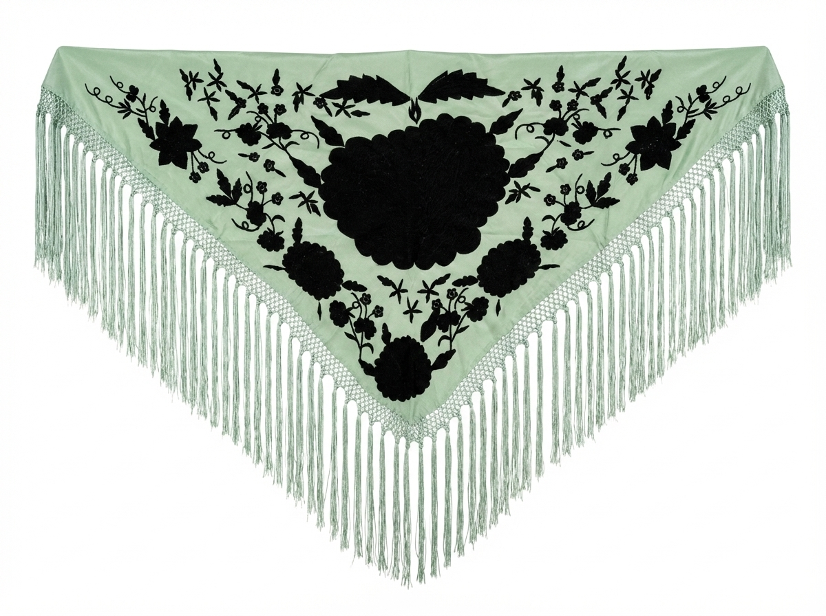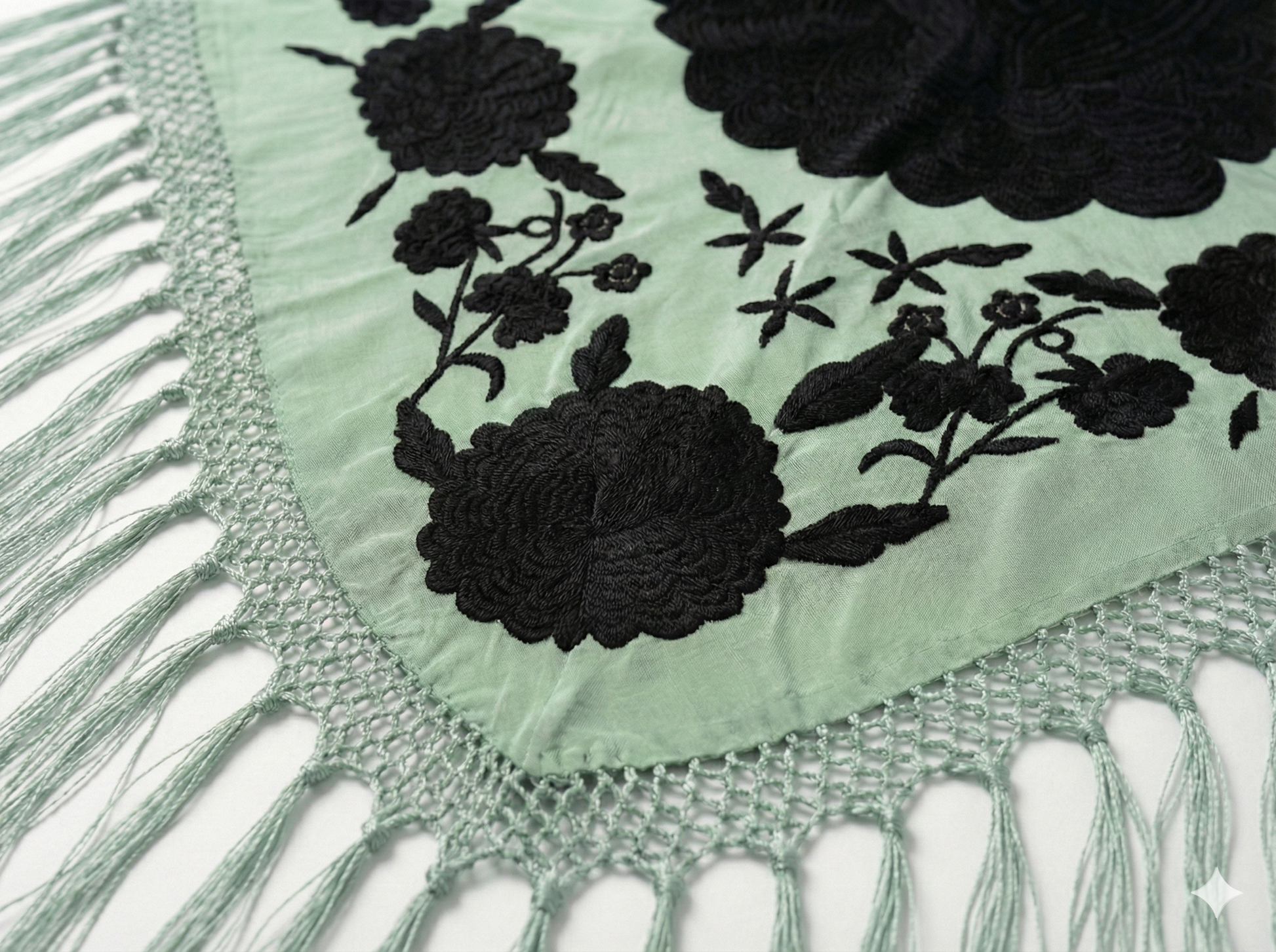Este mantoncillo es una joya para quien sabe apreciar los contrastes. Imagínate el lienzo: una seda natural en un tono verde menta (o agua) súper favorecedor, luminoso y fresco. Y sobre él, se despliega un bordado en negro azabache que es una auténtica locura.